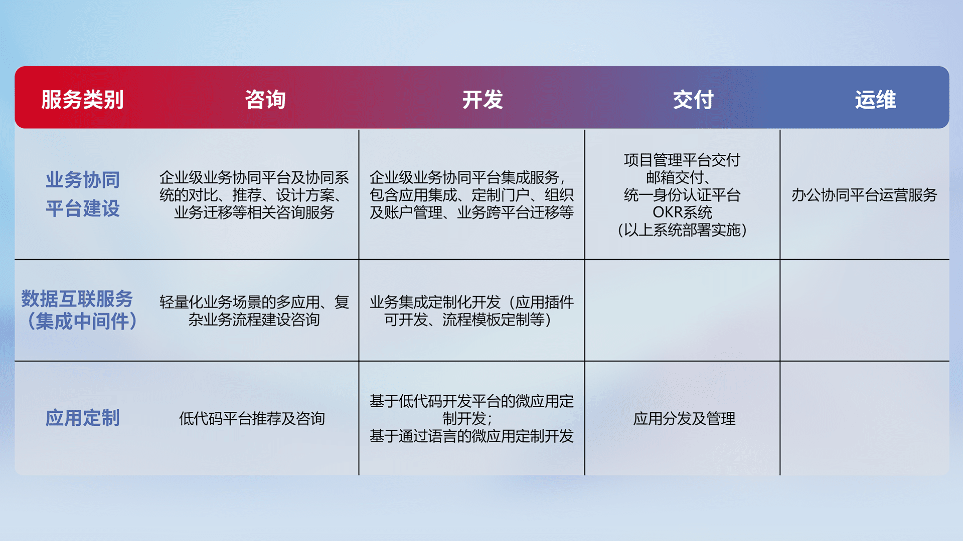 针对钉钉、、、企微、、、IDaas等平台级产品提供产品的规划、、、、方案、、交付、、、、定制化开发等服务,,实现如统一协同办公、、、智能客户服务、、混合会议管理、、智能数据查询、、等业务场景,,,实现数字化转型。。。。